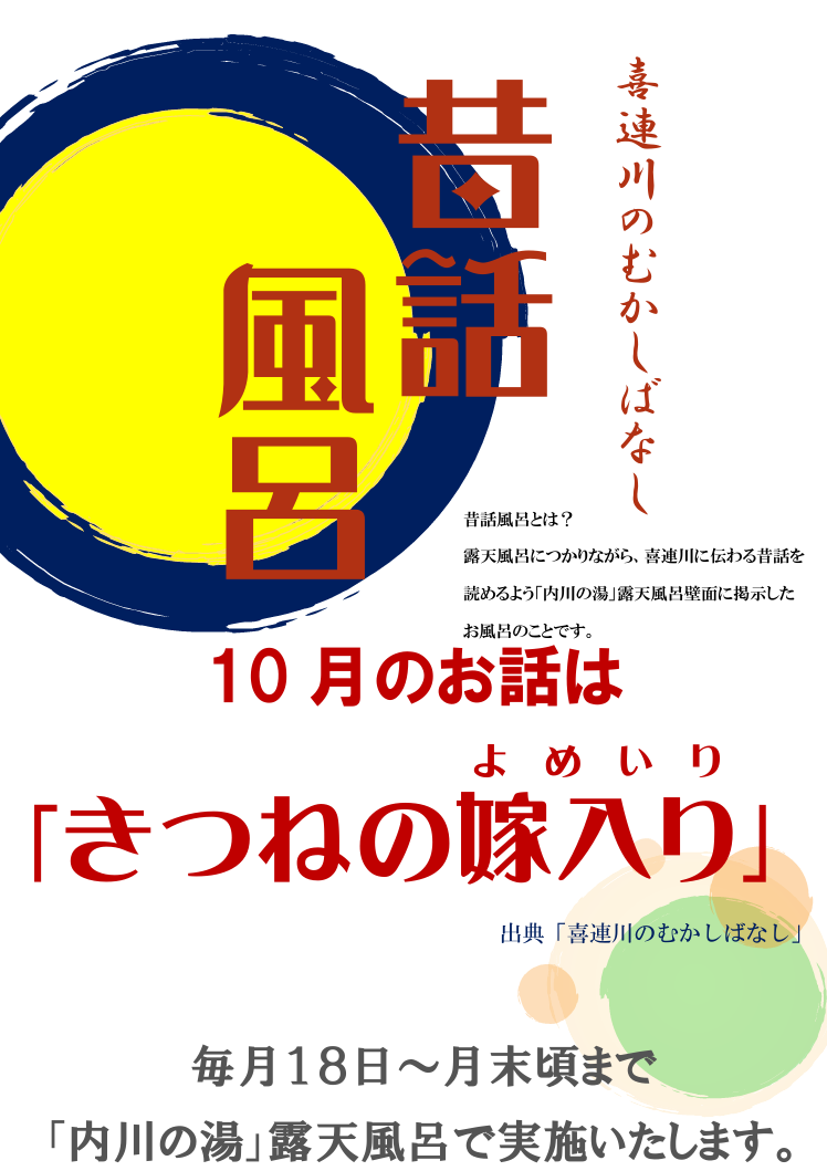 10月のお話は『きつねの嫁入り』です。温泉施設露天風呂、内川の湯壁面に喜連川の昔話を掲示いたします。…詳細を見る