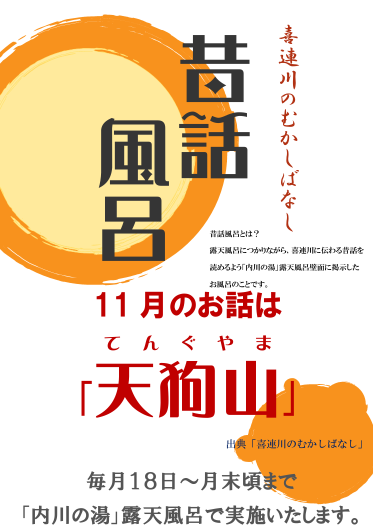11月のお話は『天狗山』です。温泉施設露天風呂、内川の湯壁面に喜連川の昔話を掲示いたします。内川の湯…詳細を見る