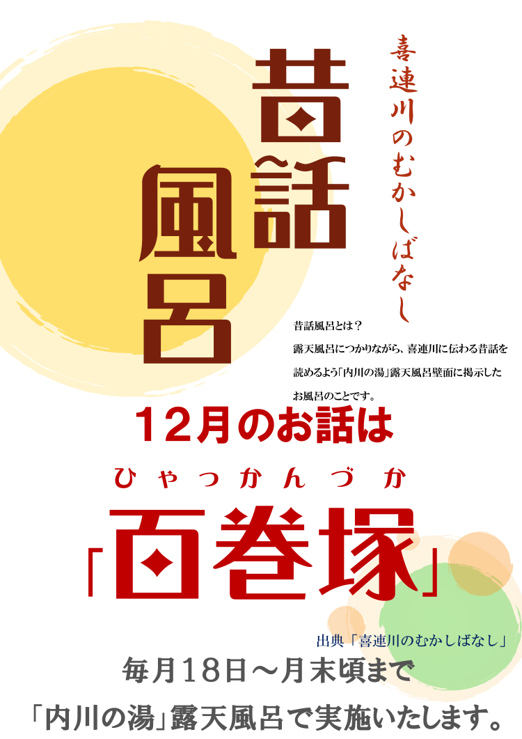 12月のお話は『百巻塚』です。温泉施設露天風呂、内川の湯壁面に喜連川の昔話を掲示いたします。内川の湯…詳細を見る