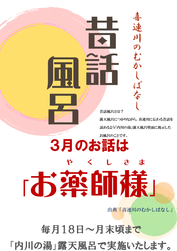 3月のお話は『お薬師様』です。温泉施設露天風呂、内川の湯壁面に喜連川の昔話を掲示いたします。内川の湯…詳細を見る