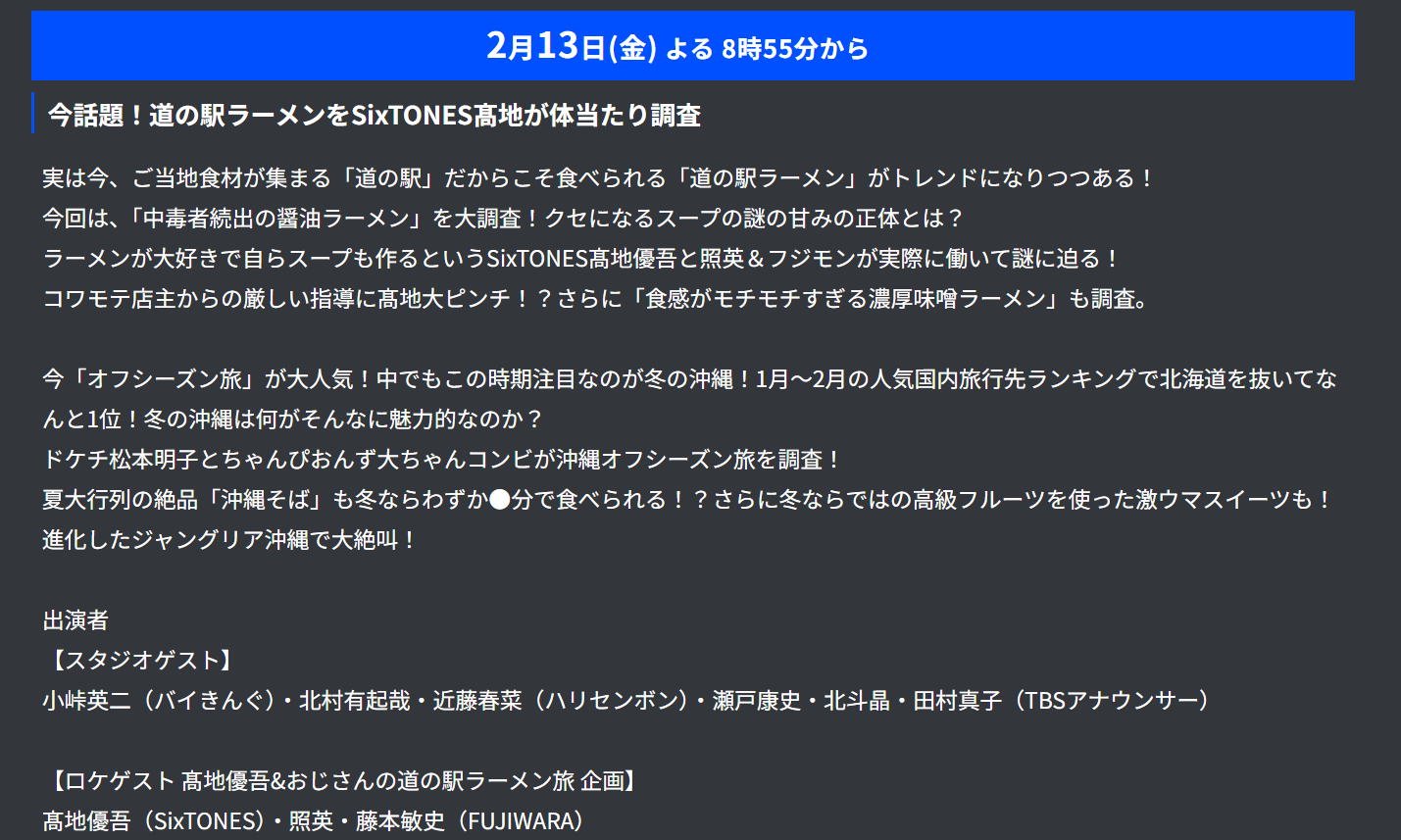 お知らせ・イベント情報 NEWS TBS『知識の扉を開け!ドア×ドアクエスト』で紹介されます 2026.02.10 2026年2月13日㈮ 夜8:55~放送のTBS『知識の扉を開け!ドア×ドアクエスト』にて道の駅きつれがわ・竹末道の駅本陣が紹介される予定です ぜひ、観てください 一覧を見る